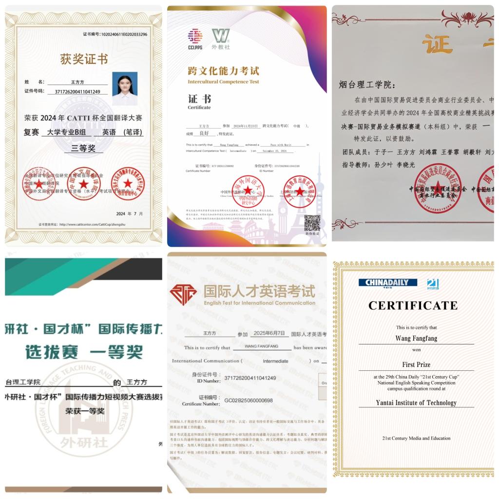大学期间考取了上海外语高级口译证书、外研社·国际人才英语考试证书(国才)、外教社·全国跨文化能力证书、高中英语、语文教师资格证、计算机二级等级证书。学科竞赛领域,她以赛带练,以赛促学,正是这种要在自己认为值得的事情上拼尽全力的劲头,让她获得省级及以上奖项十余项,总计36项荣誉。包括专业类竞赛,如全国跨文化能力竞赛国赛二等奖(5%-10%)、省赛一等奖(2%-5%);“外研社·国才杯”国际传播力短视频大赛全国海选一等奖(15%);全国高校大学生外语水平能力大赛(英语本科组)三等奖;“外教社·词达人杯”全国大学生英语词汇能力大赛-专业组三等奖(20%)、校赛特等奖两次;“CATTI杯”全国大学生翻译大赛复赛三等奖(30%)。