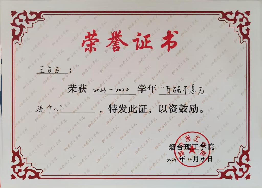 王方方,烟台理工学院外国语学院英语专业的学生,绩点4.13,专业第一,连续三年荣获国家励志奖学金、“优秀共青团员”等荣誉称号,被评为“自强不息先进个人”,26年考研成功考取211——中国矿业大学(北京)英语笔译专业。